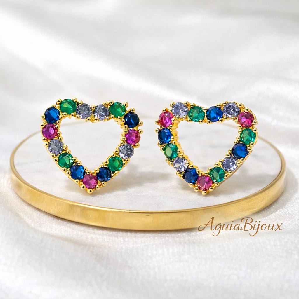 Brinco folheado a ouro em formato de coração vazado, delicadamente cravejado com zircônias coloridas, trazendo brilho e elegância à peça. O design moderno e sofisticado valoriza os detalhes, tornando o acessório perfeito para complementar qualquer look.