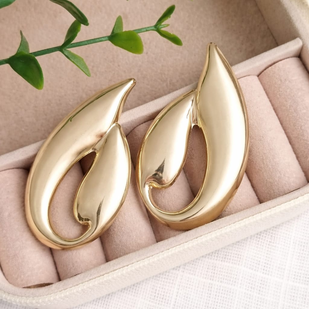 Brinco de bijuteria em metal com design em formato de gota vazada, trazendo um visual moderno e sofisticado. O acabamento dourado valoriza a peça e destaca seu estilo elegante, ideal para complementar diferentes produções com charme e personalidade.