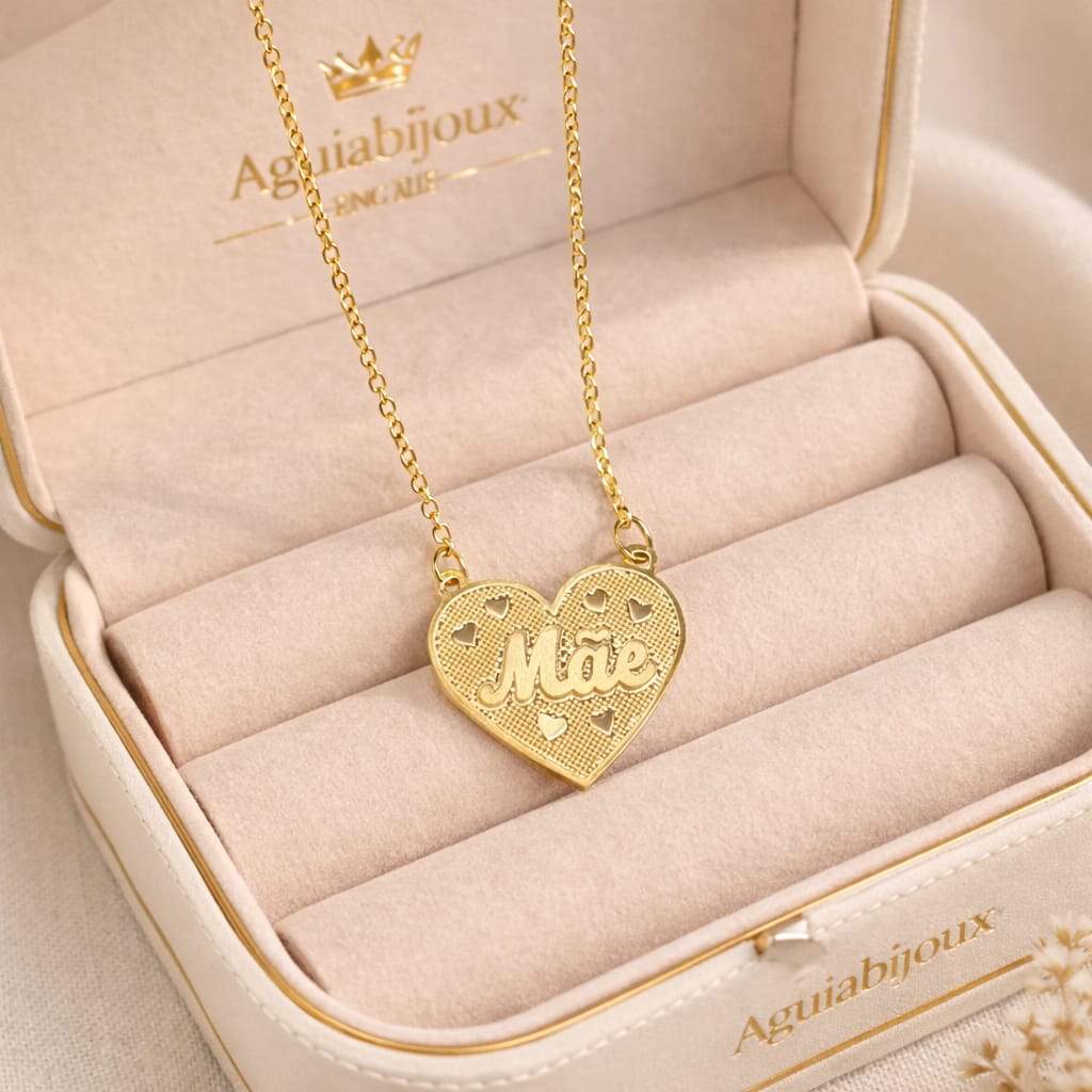 Colar folheado a ouro com pingente em formato de coração vazado, com a palavra “mãe” delicadamente escrita no centro da peça. Um acessório cheio de significado, que representa carinho, amor e gratidão.
