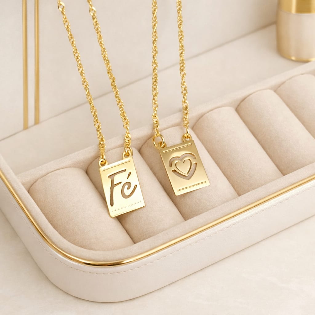 scapulário folheado, com duas placas delicadas, sendo uma com a palavra “Fé” e a outra com símbolo de coração. Uma peça cheia de significado, ideal para quem busca expressar espiritualidade e estilo no dia a dia.