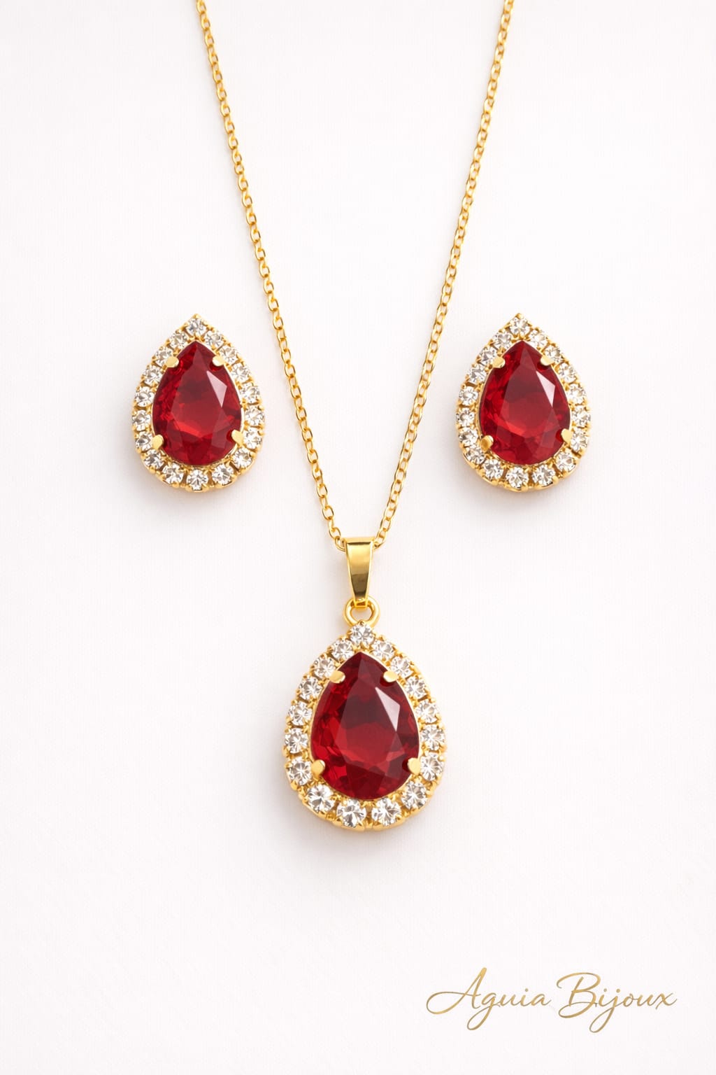 Conjunto folheado composto por colar e brinco, com pingente em formato de gota e pedra central lapidada com contorno cravejado em strass, proporcionando brilho intenso e acabamento sofisticado. Disponível em diversas cores, é uma peça elegante e versátil, ideal para ocasiões especiais ou para valorizar produções mais refinadas.